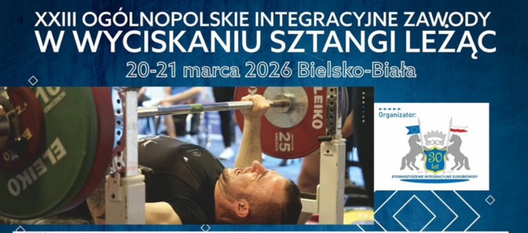 Aktualności16.03.2026XXIII Ogólnopolskie Integracyjne Zawody w Wyciskaniu Sztangi Leżąc, Bielsko-Biała 21.03.2026